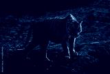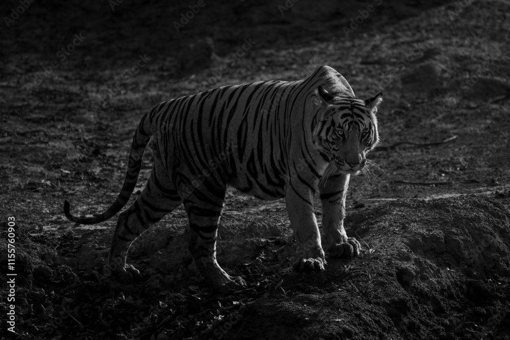 Mono tiger stands on bank by waterhole