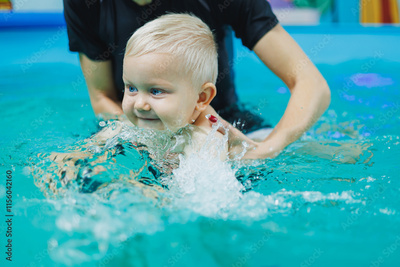 A child swims with his mother in a children's pool. A mother teaches her little son to swim.