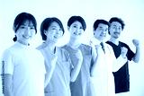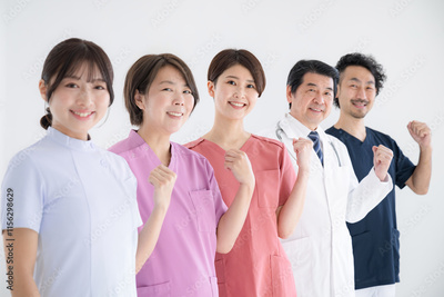 ドクターや看護師の楽しそうな転職成功などにガッツポーズのカメラ目線 横並びの医療従事者のイメージ