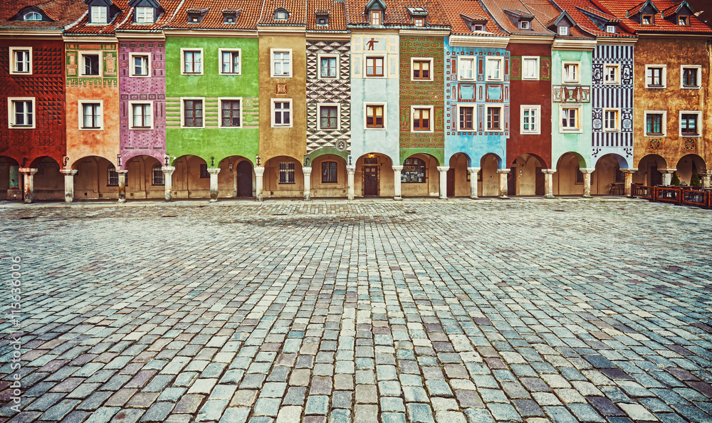 Vintage stylized colorful houses in Poznan Old Market Square, Poland.