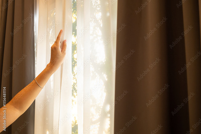 The woman was at the window in the bedroom. She opened the curtains on the window. In the morning and she looks at the view of mountains and trees at sunrise