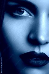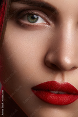 Beautiful model with fashion make-up. Close-up portrait sexy woman with glamour lip gloss makeup and black eyeliner make-up. Shot of celebrate visage, clean skin, lips with red lipstick, eyebrows