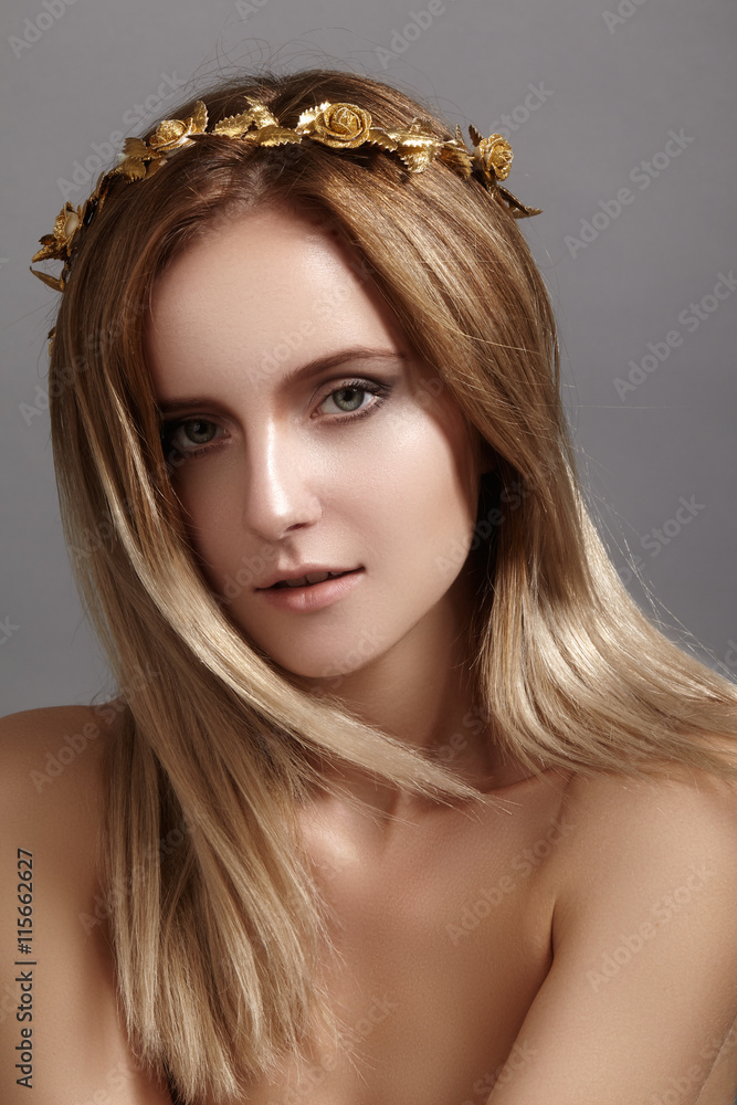 Beautiful young woman with gold crown, flying light color hair. Beauty portrait with clean skin, glamour fashion makeup. Accessories, make up, hairstyle. Haircare, make-up