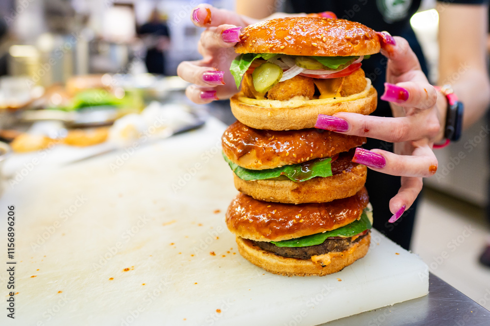 A towering burger with multiple layers, featuring fresh lettuce, tomatoes, pickles, and crispy elements, held by hands with vibrant nail polish in a vibrant kitchen setting.