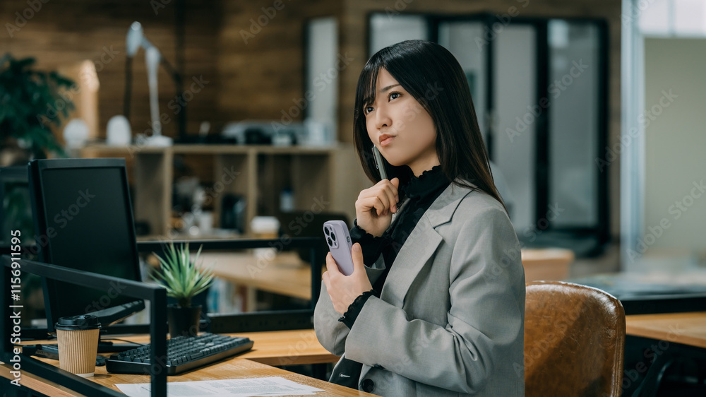 スマホを持って考えごとをする女性・ビジネスウーマン