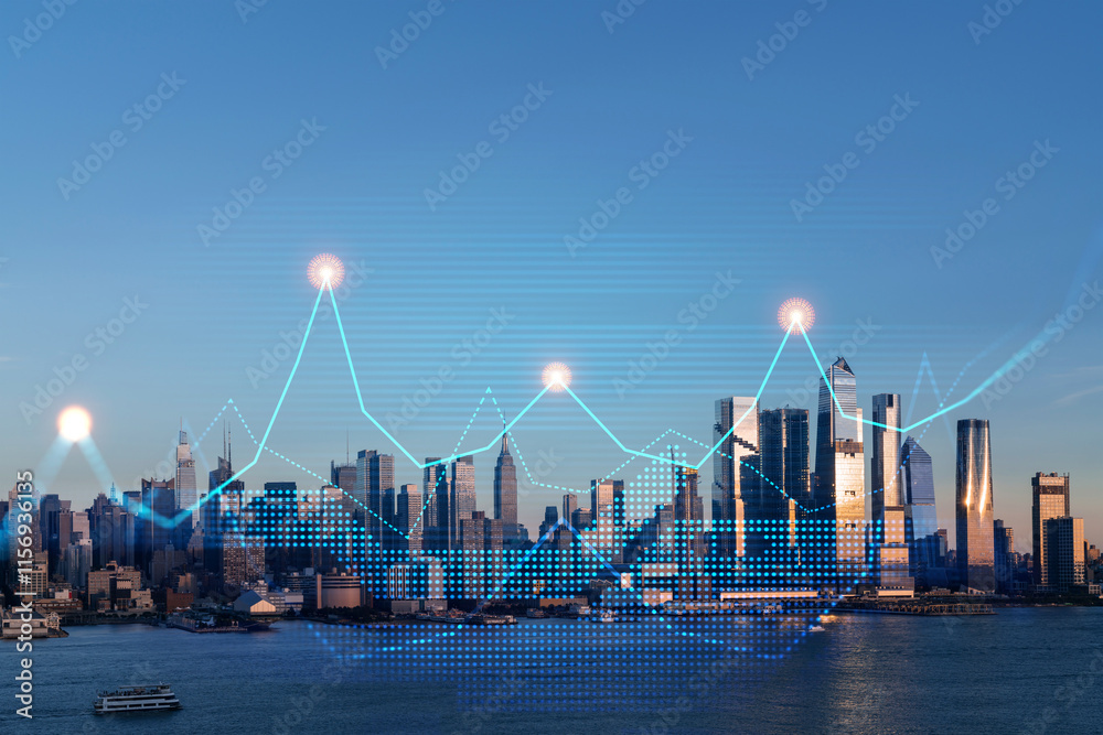 Skyscrapers Cityscape Downtown View, New York Skyline Buildings. Beautiful Real Estate. Sunset. Forex Financial graph and chart hologram. Business education concept.