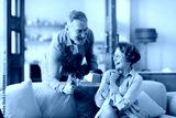 Loving senior man giving bouquet of flowers and gift box to surprised wife, sitting on sofa at home. Birthday, anniversary or Valentine's day celebration