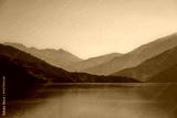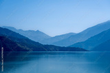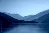 Multilayered blue mountains are shrouded in mist, with blue light cascading over them and the lake waters. This picturesque scene at Tehri Lake captures the enchanting interplay of light and nature.