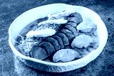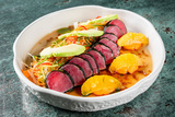 A beautifully presented dish featuring thinly sliced beef arranged artfully with vibrant vegetables, garnished with orange segments and drizzled with a savory sauce. Perfect for food photography.