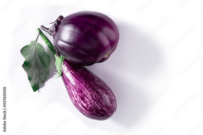 Varieties of eggplants. Spotted Eggplant Graphite, purple round eggplant on white background. Raw berry, fresh nightshade fruit
