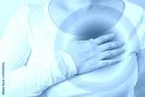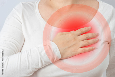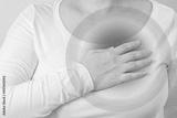 Female hands massage a painful chest with heart pain. Women's health, middle age.