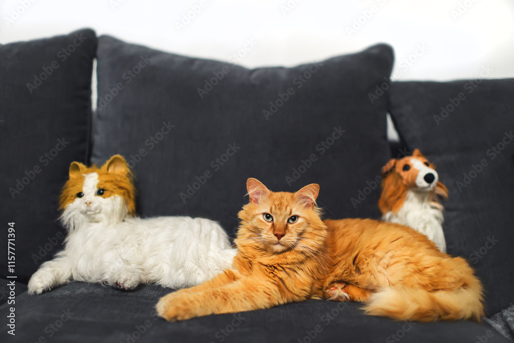 Cute fluffy ginger cat lies on a gray sofa among soft toys in the room.