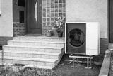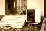 Air source heat pump installed outside of old renovated house, green renewable energy concept of heat pump
