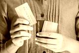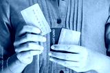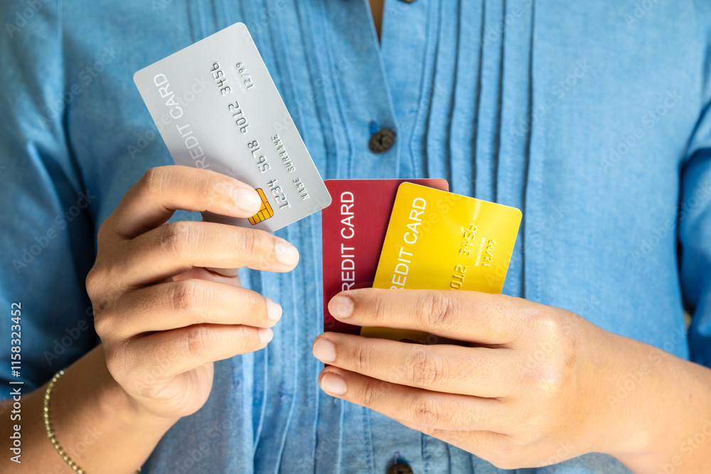 Woman holding credit cards and he is choosing a credit card to pay and spend Payment for goods via credit card. Finance and banking concept
