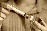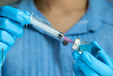 doctor's hand holds a syringe and a blue vaccine bottle at the hospital. Health and medical concepts