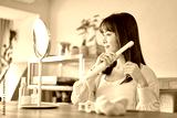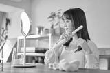 朝の身支度。ストレートアイロンで髪をヘアスタイリングしている若い女性。