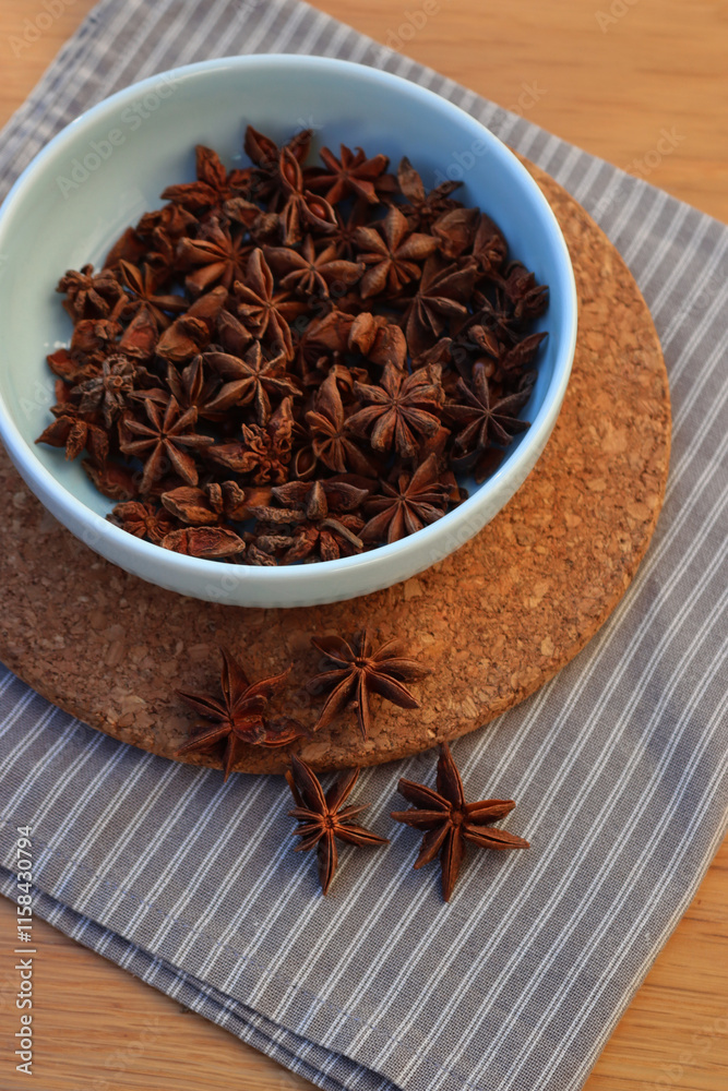 Top view of dry Anise stars spices in a blue ceramic bowl on wooden table. Illicium verum