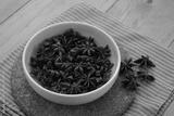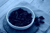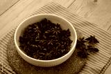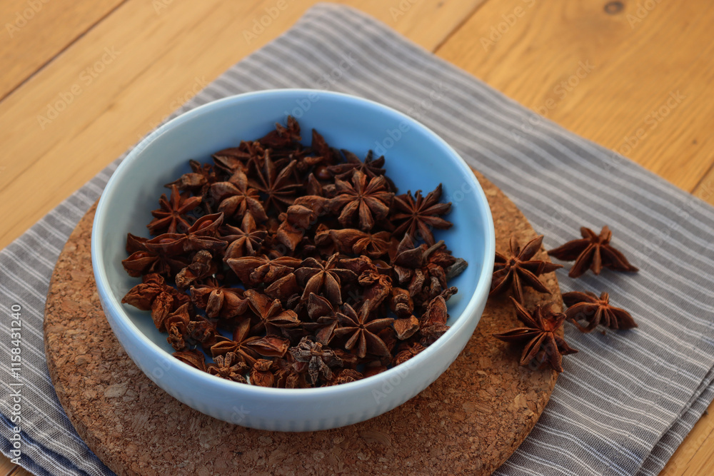Top view of dry Anise stars spices in a blue ceramic bowl on wooden table. Illicium verum