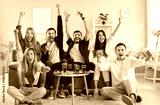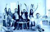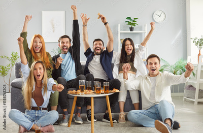 Group of friends watches football on TV at home, celebrating a goal by enjoying pizza and beer. The lively atmosphere showcases fun, food, and excitement as they share this moment during a party.