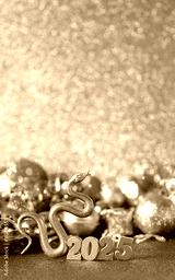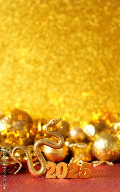 golden Snake figurine with 2025 numbers, festive new year decor on abstract glittering background close up. symbol of Chinese new year 2025, Year of the snake. lunar calendar concept. copy space