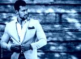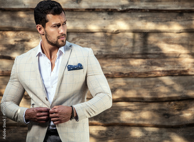 Portrait of young beautiful fashionable man against wooden wall.