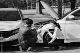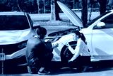 Insurance agents assist clients in an outdoor setting after a car accident, inspecting the vehicle for damage, discussing policy coverage, repair options, liability, and pursuing a claim.