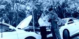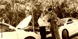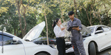 Insurance agents assist clients in an outdoor setting after a car accident, inspecting the vehicle for damage, discussing policy coverage, repair options, liability, and pursuing a claim.