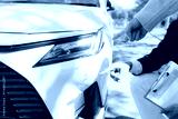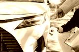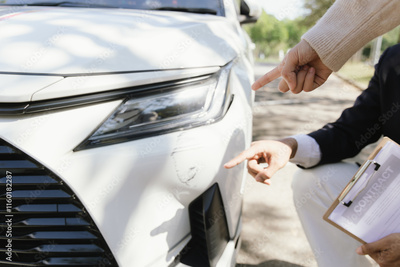 Insurance agents assist clients in an outdoor setting after a car accident, inspecting the vehicle for damage, discussing policy coverage, repair options, liability, and pursuing a claim.