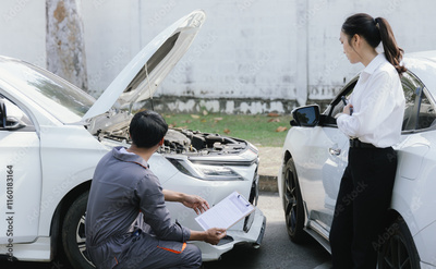 After a car accident, an insurance company assesses the damaged vehicle, demonstrating state-of-the-art assistance, coverage, and recovery services.