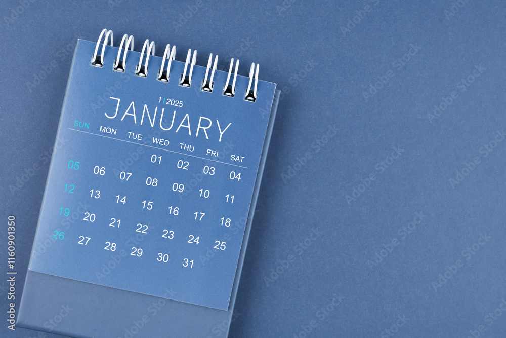 January 2025 calendar on blue color background. Desk calendar for planning.