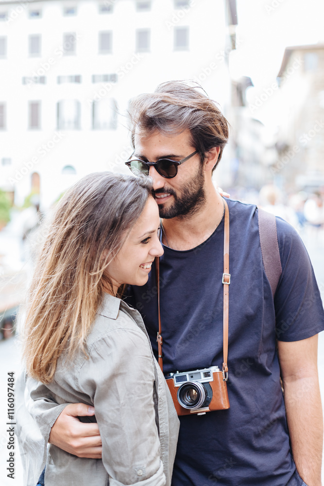 Loving young couple hugging each other in the historic city center of Florence, Tuscany