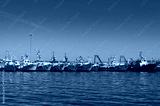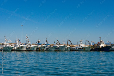 Boats, yachts on turquoise blue water with sun specks, reflections on boards against clear blue sky on the background. Summer vacation scene with copy space