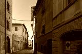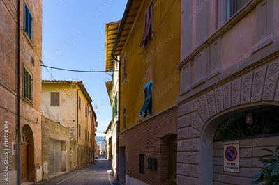 Narrow European town street with sea view. No Parking sign in Italian. Orbetello, Italy
