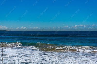 Beautiful ocean surface with moderate surf against blue sky on the background. Cronulla, Australia. Copy space