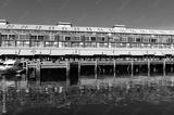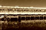 Finger wharf restaurants and hotel in Woolloomooloo bay with unrecognisable people in the distance. Sydney, Australia