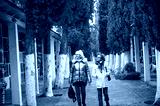 Two women strolling through a peaceful cemetery walkway lined with tall cypress trees and graves, enjoying the serene and reflective atmosphere.