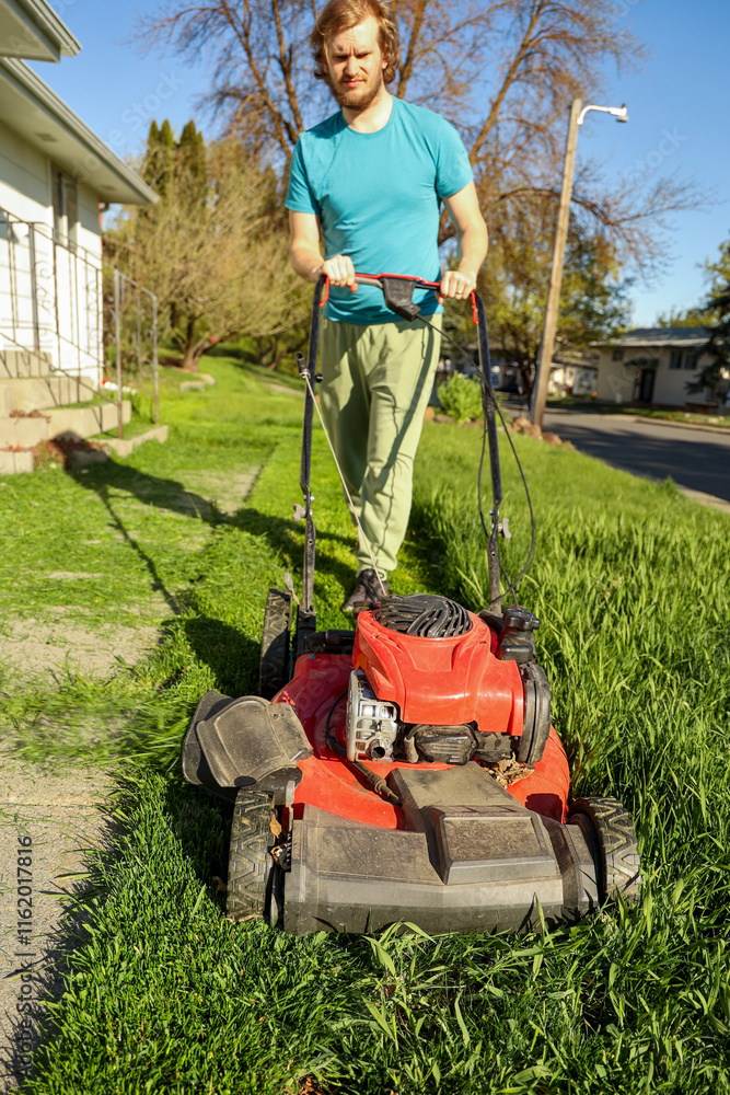 Man mowing a green lawn with a red lawn mower on a sunny day