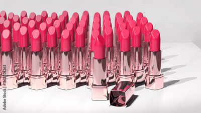 collection raspberry, pink lipstick tubes arranged elegantly, representing sophistication of natural, high-end makeup products, 3d render