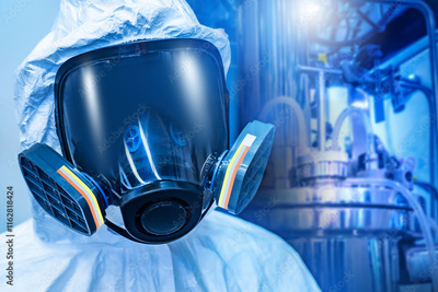 Chemical protection suit. Man in gas mask. Scientist near bioreactor. Biologist uses protective suit. Gas mask for working with dangerous research. Chemical laboratory worker in respirator