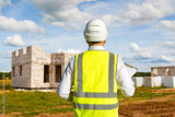 Man builder with his back to camera. Architectural engineer in reflective vest. Builder near country brick house. Inspector inspects construction site. Man builder in white protective helmet
