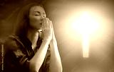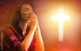 Christian woman praying to god. Girl makes prayer gesture. Catholic crucifix glows in sky. Christian cross near woman. Female prays to lord. Lady prays and asks Jesus for help. Orthodox believer