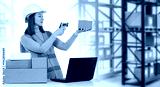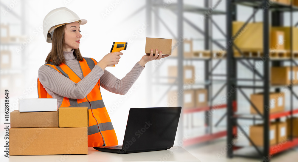 Woman storekeeper. Laser scanner in hands of warehouse worker. Storekeeper girl holds box and data collection terminal. Woman warehouse manager near racks with pallets. Storekeeper in reflective vest
