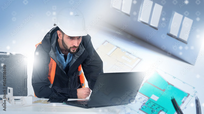 Man architect. Engineer near construction drawings. Architect uses laptop to design. Model of house behind architect. Man from construction company in helmet. Construction worker stands at work desk