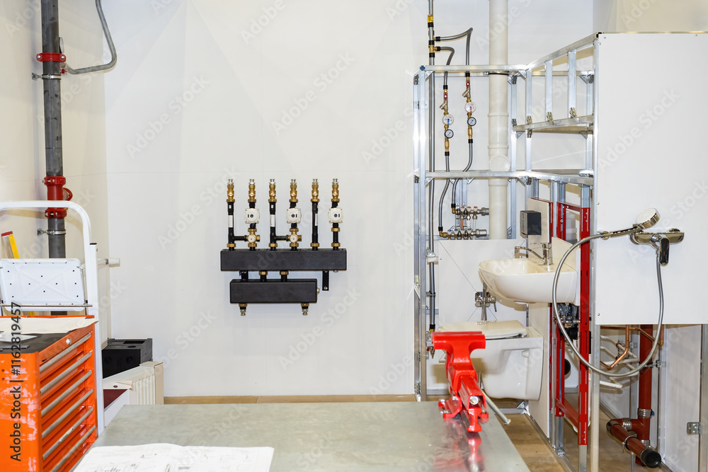 Bathroom under construction. Installation of utilities in bathroom. Old tool cabinet near plumbing fixtures. Sinks and toilet are attached to metal frame. Bathroom at time of equipment installation