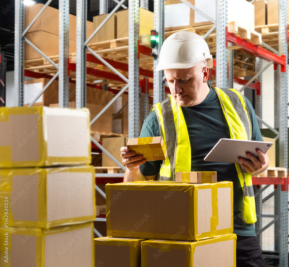 Man warehouse contractor. Worker counts boxes standing in storage. Fulfillment company contractor with tablet computer. Man storekeeper in yellow vest. Warehouse contractor near racks of pallets