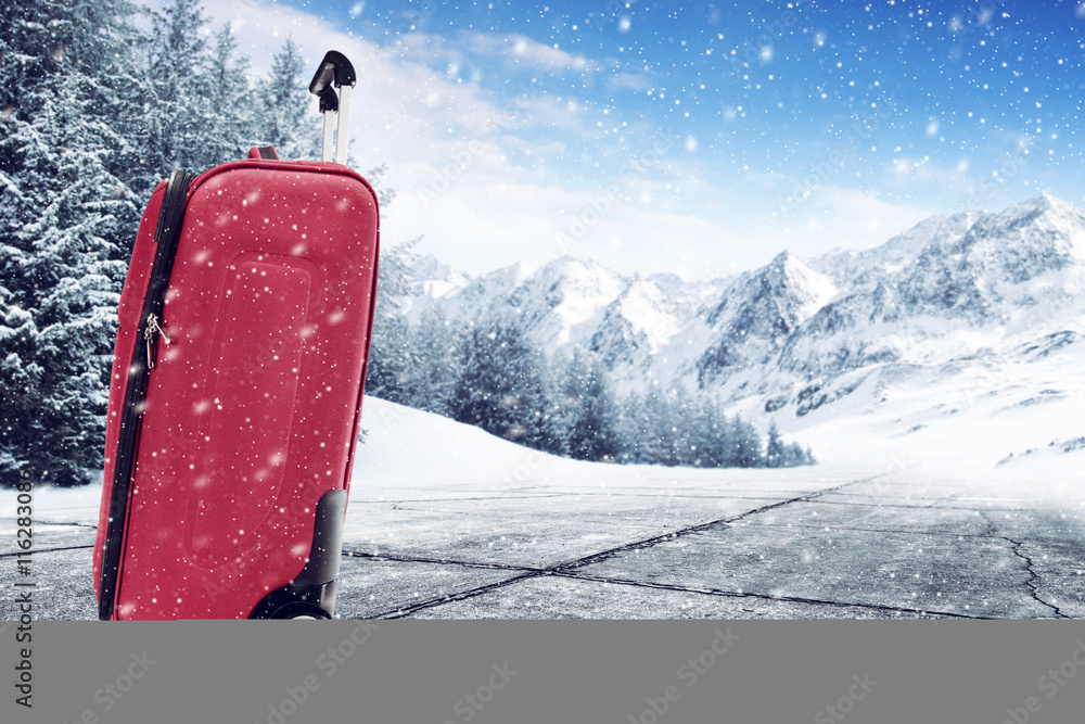 Red large suitcase placed on snow covered surface with ski slope and mountains background, Concept of travel, winter holidays, and winter sports.