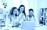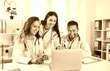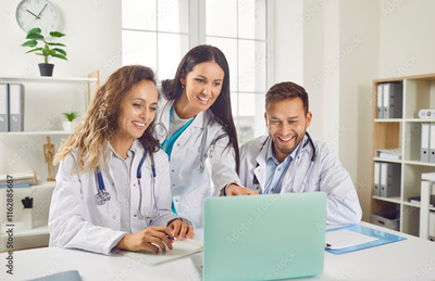 Doctors looking at laptop laptop at the desk at workplace in clinic during a meeting discussing diagnosis, checking test results or planning treatment. Medical staff, healthcare and teamwork concept.