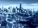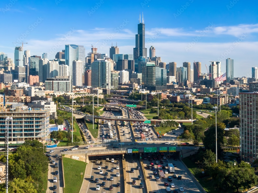 Chicago skyline and highway traffic. Busy interstate with numerous vehicles, construction, and city buildings. Elevated view. Kennedy Expressway, Chicago, Illinois, United States