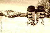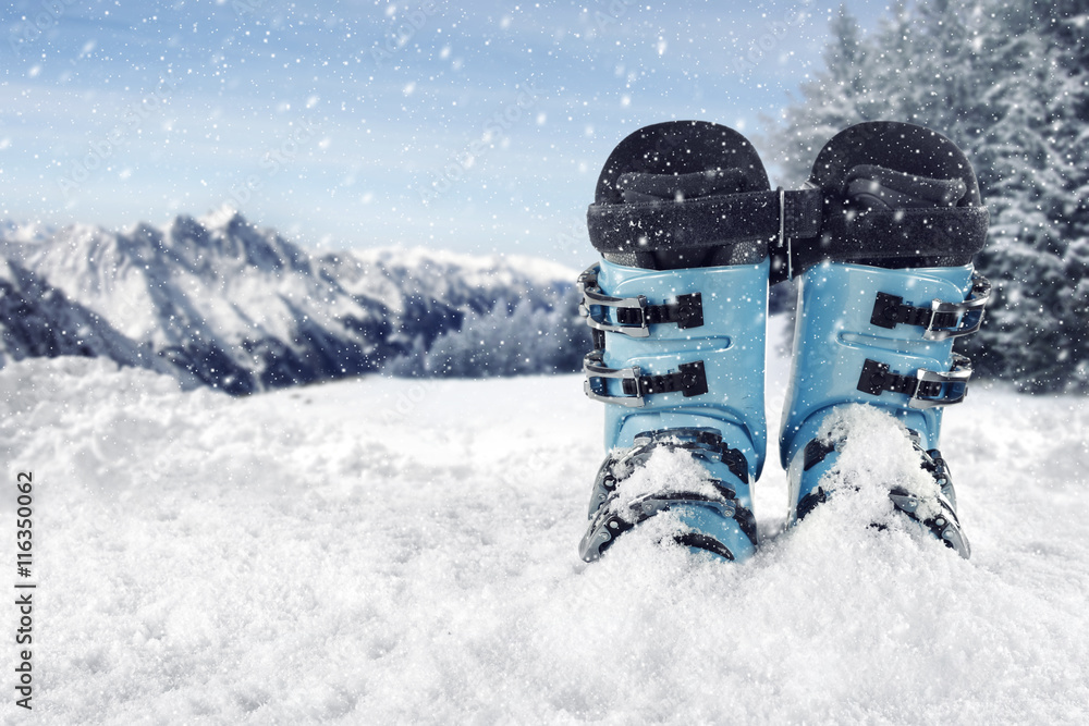 Ski boots on fresh snow at ski slope, with blurred winter mountain background. Concept of travel, winter holidays, and skiing sports.