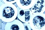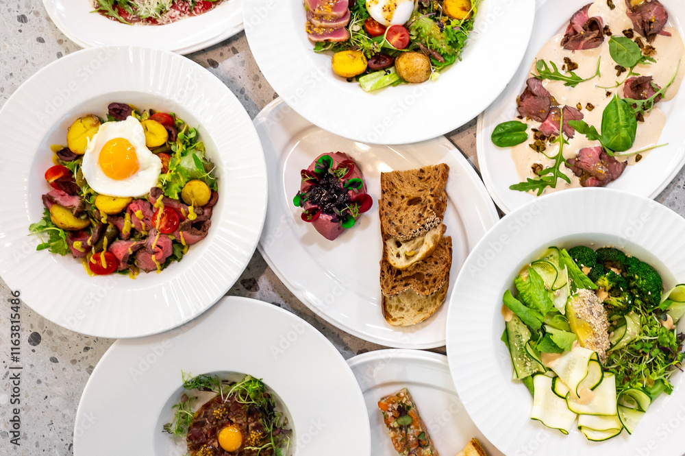 A vibrant overhead arrangement of various gourmet salads and dishes, featuring fresh greens, roasted meats, and colorful garnishes, all presented on elegant white plates. Perfect for food promotions.